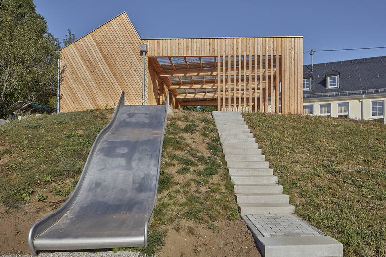 Ein wichtiger Entwurfsansatz war die Berücksichtigung der Topographie sowie die funktionale Verbindung zu Freibereichen, die als Spielplatz genutzt werden können.