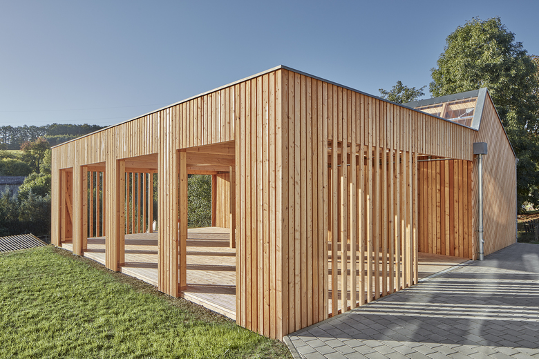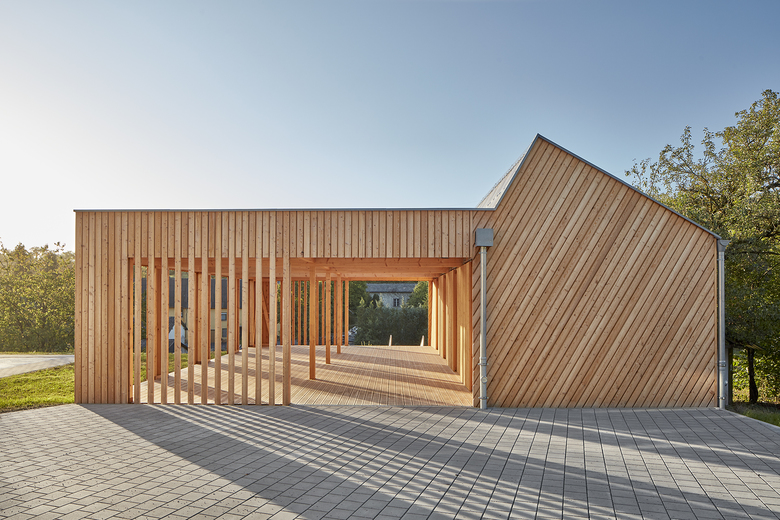 Der Gemeindeplatz, in unmittelbarer Nähe des Gemeindehauses gelegen, dient als Ort der Versammlung und kleinerer, dörflicher Feste. Eine Holzkonstruktion aus Lärche bildet den kommunikativen Treffpunkt und Versammlungsort der Gemeinde. Geschlossene Bereiche dienen als Depot, die offenen Bereiche sind überdacht, um die Bewohner bei Gemeindefesten und -treffen vor Wind und Wetter zu schützen.