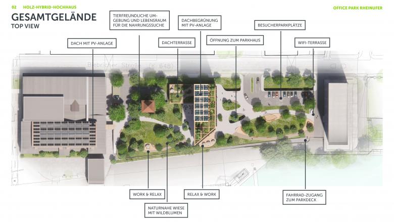 Der H2-Office-Tower ist Teil eines am Wiesbadener Rheinufer gelegenen Entwicklungsgebietes, das als Vorzeigeprojekt für eine nachhaltige, smarte und zukunftsorientierte Stadtentwicklung steht. Die Studie im Auftrag der Wiesbadener Stadtentwicklungsgesellschaft SEG untersucht die Umgestaltung einer Industriebrache in ein campusähnliches Areal, das alle Erfordernisse moderner Büro- und Arbeitskultur im verdichteten urbanen Umfeld berücksichtigt: CO2-reduzierter Neubau neben ressourcenschonender Sanierung plus grüner Verdichtung, Schaffung urbaner Biotope und Förderung von Mikromobilität.