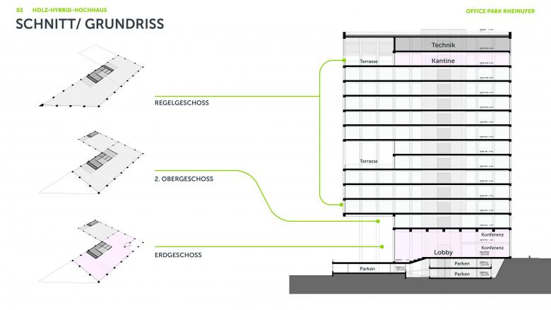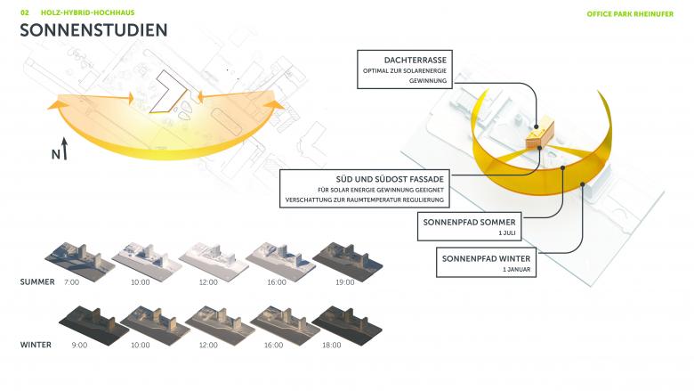Die Grundkonzeption des 15-stöckigen Hochhauses ergibt sich primär aus klimatischen und energetischen Erwägungen. Die der Sonne zugeneigten Fassaden werden partiell mit Photovoltaik-Modulen belegt, die gleichzeitig als Verschattungselemente dienen. Die Rheinfassade wird in ihrer Ausrichtung diagonal verdreht und somit auf den Sonnenstand optimiert, um aus der großflächigen Integration der PV-Module maximale Effizienz zu erzielen.