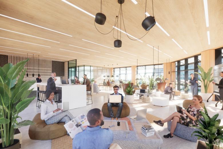 Mit klarem, reduziertem Design entwickelt 3deluxe ein smartes Büro-Holz-Hochhaus, das in eine lebendige grüne Umgebung eingebettet wird und in einem bislang industriell geprägten Umfeld neue wegweisende Zeichen architektonischer und städtebaulicher Entwicklungen setzt.