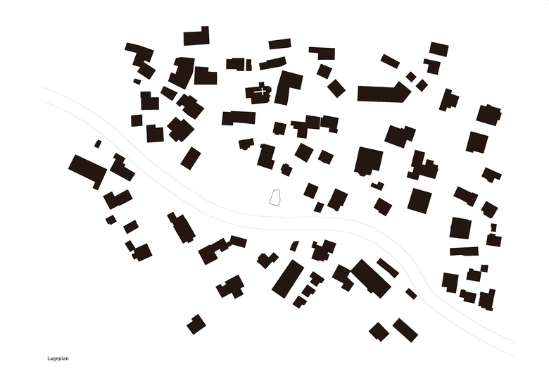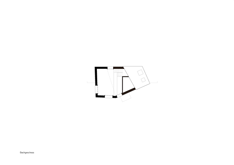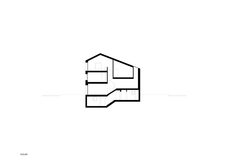Die ansteigende Dachform macht die nach oben trachtende lose Raumabfolge erkennbar. Lichthöfe verbinden die einzelnen Wohnebenen. Quadratische Fensteröffnungen in unterschiedlicher Grösse beziehen sich auf signifikante Punkte der ummittelbar steil aufragenden Berglandschaft.