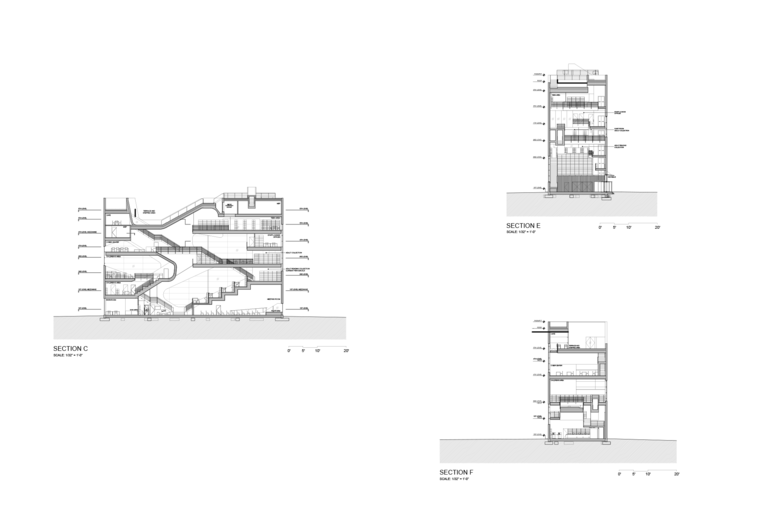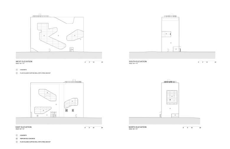 The vertical structure reimagines the traditional library model, providing diversity of spaces from intimate reading areas to active gathering spaces. The building’s aluminum-painted concrete shell is not just a facade but a load-bearing structure, which omits curtain walls and columns. Sculpted cuts are carved out of the facade, showing the movement of people within and framing expansive views of the Manhattan skyline.