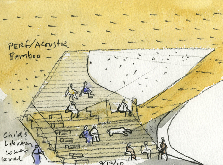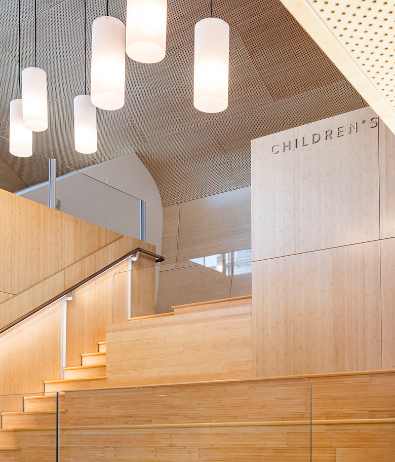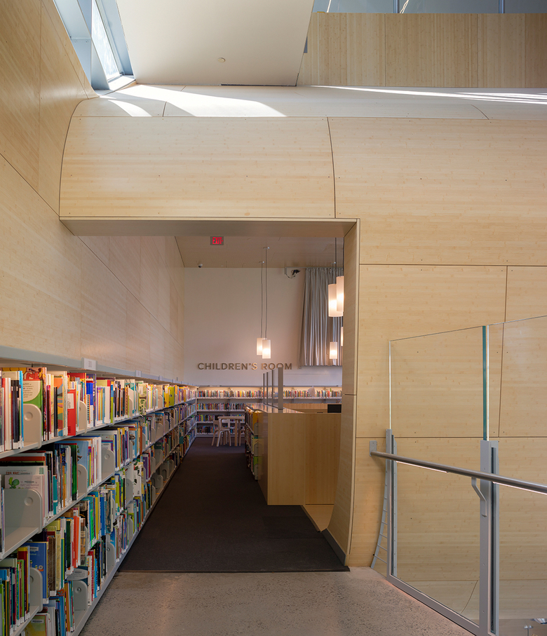 The program's separation into children's area, teen area and adult area can be read in the sculpted cuts of the east face of the building, one facade opening for each area; yet the programmatic divisions are fluid. Inside, warm bamboo creates an inviting social space, open to the community and offering engaging spaces for all ages. Natural light enters through the large windows from all sides, animating the space.