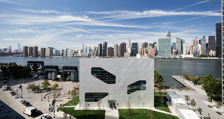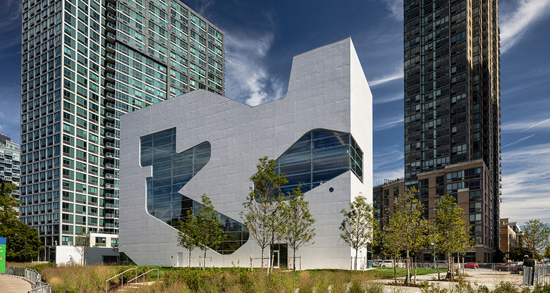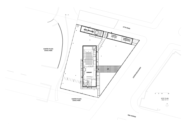 Located on a prominent site along the East River, against the backdrop of rapidly built skyscraper condominiums, the 22,000 square foot Queens Public Library at Hunters Point stands as a public building and public park, bringing community-devoted space to the Long Island City waterfront.