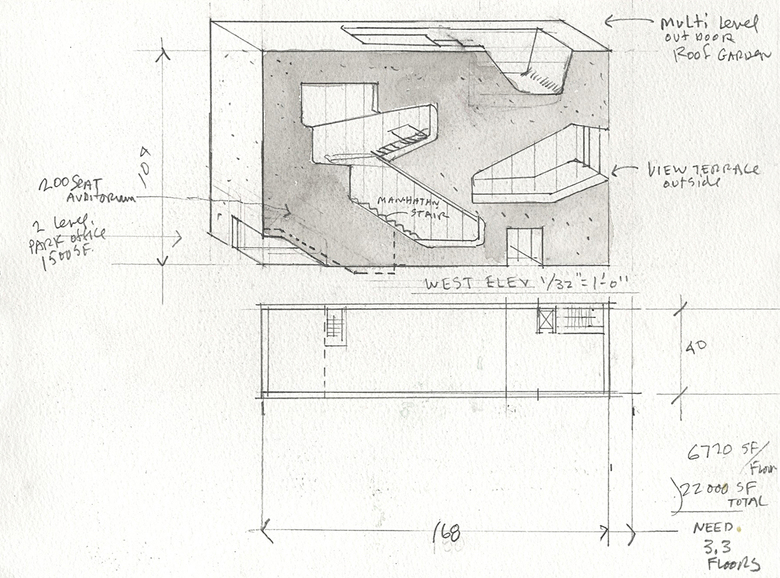 The digital and the book are merged through the bookshelves and adjacent digital workstations that flow upward along a series of open stairs. A ground-level auditorium under the main section provides public meeting and events space. The stairs switch back from mezzanine to mezzanine, connecting reading areas and concluding in a rooftop reading terrace with views of the city and the river. While the plan is compact, the building section of the new library is open and flowing to allow for the most energy-efficient design and the greatest amount of public green space on the site.