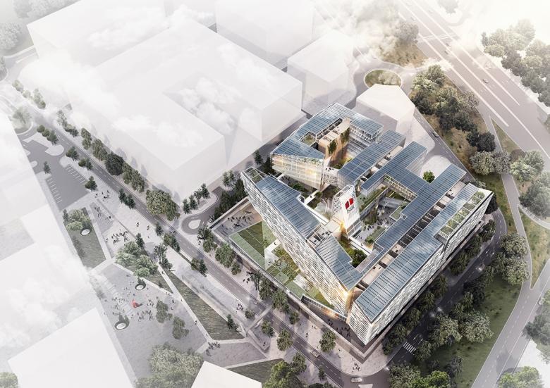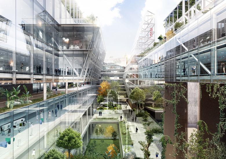 Qui —come nelle numerose terrazze, cortili e giardini pensili— si rintraccia l'aspirazione urbana del progetto, in grado di offrire ai dipendenti dell'azienda il necessario benessere ambientale e lavorativo. Il complesso architettonico si immagina infatti come un'infrastruttura urbana da cui nasce il tema del progetto "Città della Statistica".
