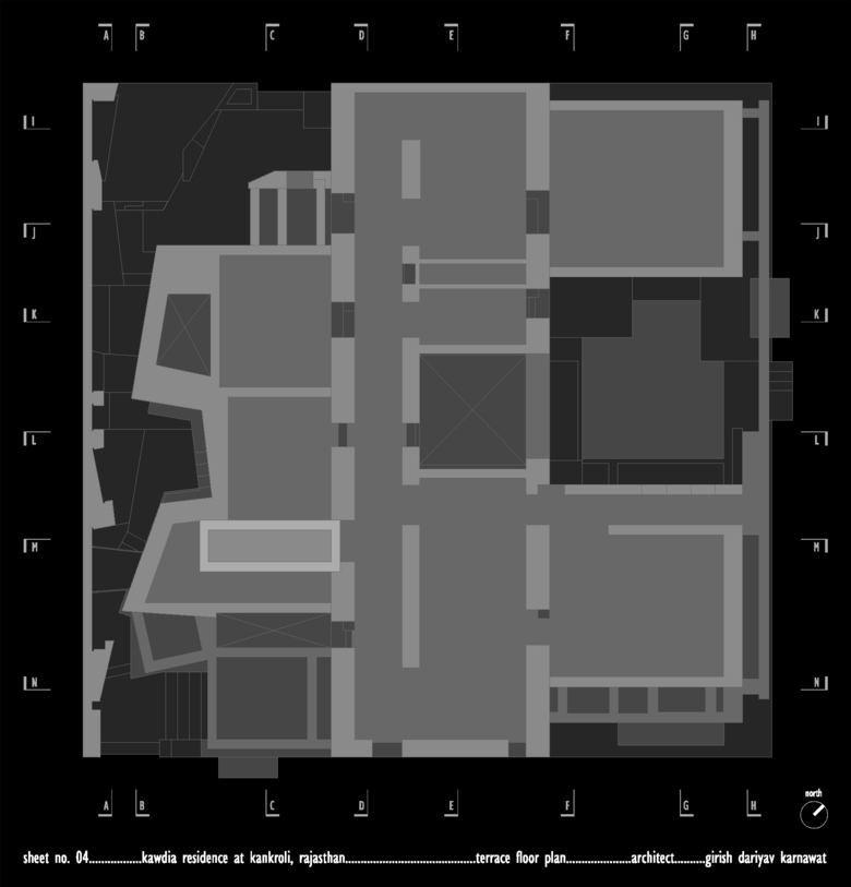The plot is flanked with streets on three sides.An internal street on the fourth side was created thus rendering it symmetrical along both its axis in terms of solid and void.The plot subsequently was divided into nine squares.The house has a family entrance on north west and a guest entrance on south west.A third entrance for services was created on the north east facade that led to the central courtyard.Owing to the sloping nature of the site, a basement was introduced to house a guest bedroom and an office space which have a separate access from the internal street on north west.