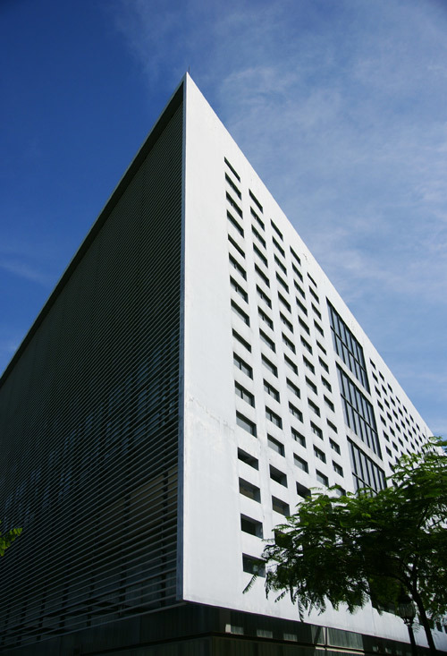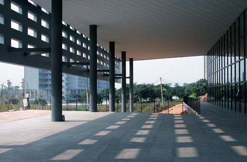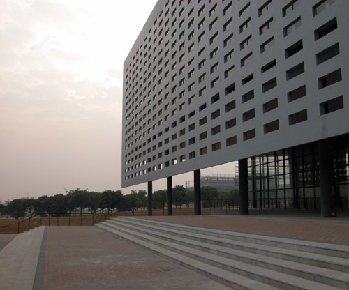 to the west and the plaza to the east. Taking advantage of the site condition, the grand steps add monumentality for the east and south fronts. The  internal streets allow sunlight to reach the center of the building. It also form  visual corridors, bringing natural views into the depth of the building. The south and north facades feature plain concrete wall punctuated by small windows. The east and west facades are made of an inner layer of sliding windows and an outer layer of aluminum shutters which provide shading, prevent glare, and give the building a fresh and transparent feel.