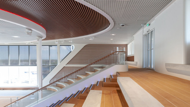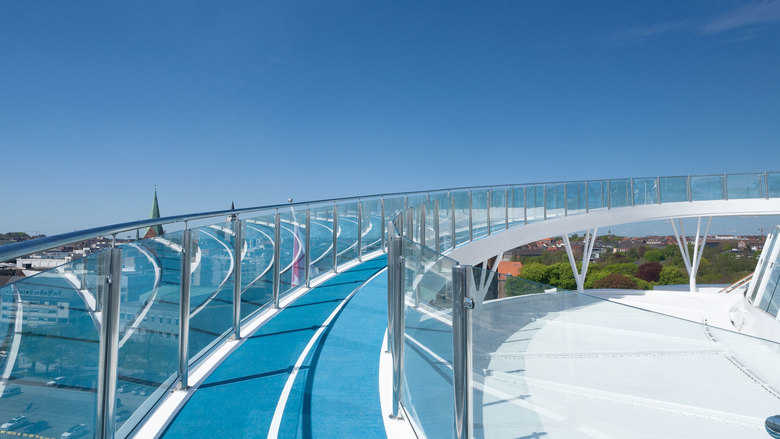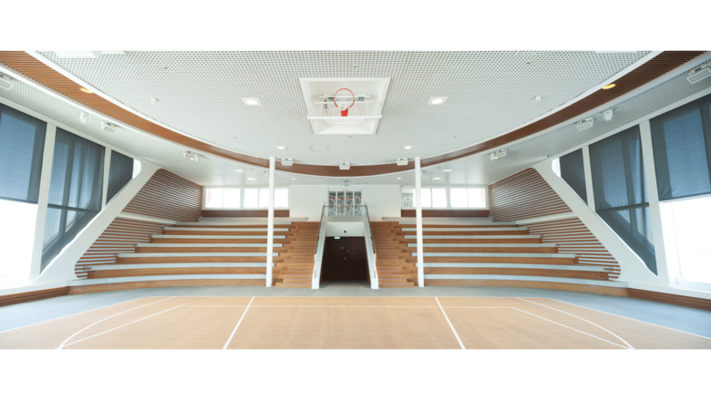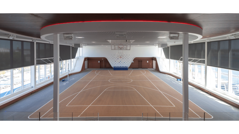 Ein modernes und anspruchsvolles Angebot an sportlichen Aktivitäten ist wesentlicher Bestandteil der TUI Cruises Philosophie. Neben der Joggingstrecke unterstreicht auch die von 3deluxe gestaltete ‚Arena‘ diesen Anspruch. Die große überdachte Halle bietet zahlreiche Sportmöglichkeiten von Kletterwand über Indoor Cycling und TRX-Ganzkörper-Workout und ist zusätzlich als Veranstaltungsfläche nutzbar.