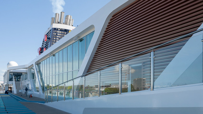 Eine sehr offen gestaltete, zu den Seiten hin weit auslaufende Glasfassade, der so genannte „Diamant“, definiert die charakteristische Heckansicht des Schiffes und bietet von innen einen beeindruckenden Panoramablick.