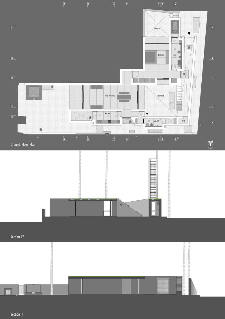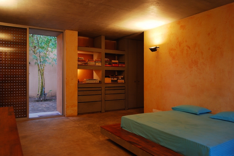 The course of action has been one of minimality in process rather than in appearance. Just as the plan has been reduced of elementality, so do the finishes employ reduction in layers/ materials. For instance, to drain the terrace valleys, sufficient measures were created within the slab while casting the RCC with required waterproofing ingredients, thus avoiding any additional layers for either waterproofing or slopes. The slab soffit has been left exposed; and the waterproof plywood sheets used as form-work were recycled to make the required furniture for the house. Paint - both from the wall and the plywood surfaces - has been done away with since the base layer of putty itself provides adequate protection. Similarly, the bedding mortar itself – when reconstituted and laid appropriately – gives the IPS floor-finish, thus avoiding the need for any further layer of stone or tile finishes. Each of these processes gives rise to its own appropriate aesthetic, just as rethinking the plan allows for a richer, if not new, spatiality. Nevertheless, both demand a shift from conventions (personal or collective), not only in the designer’s approach but also in the inhabitant’s ways of seeing.