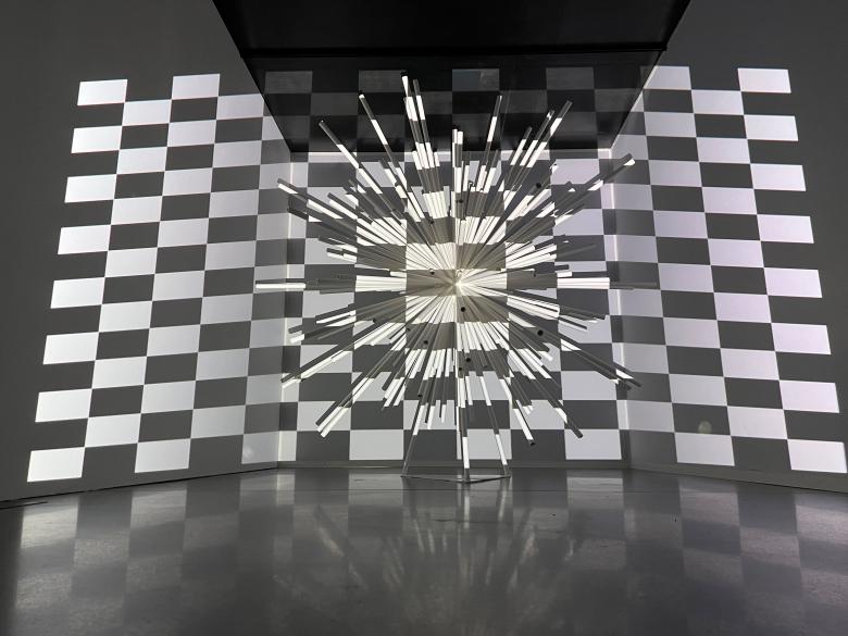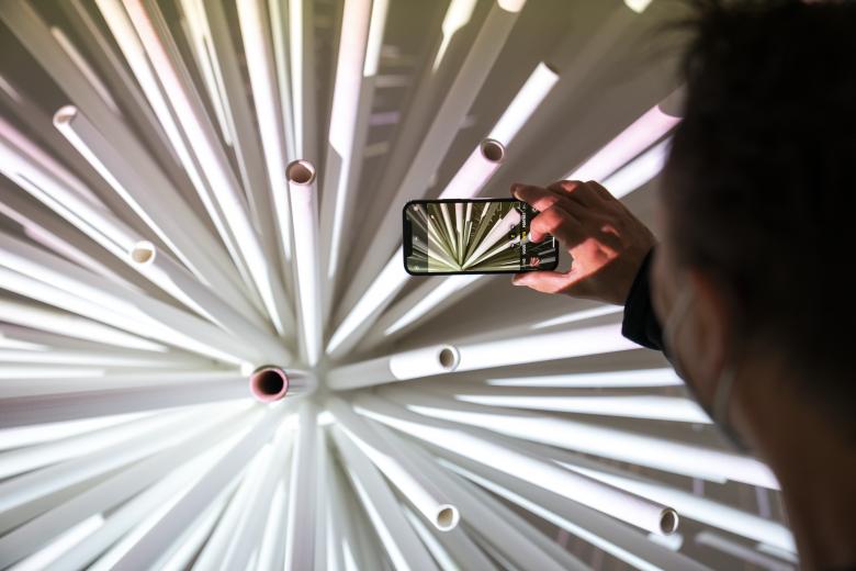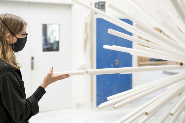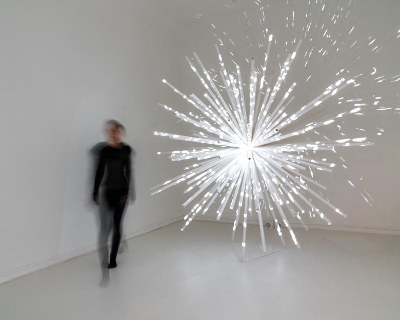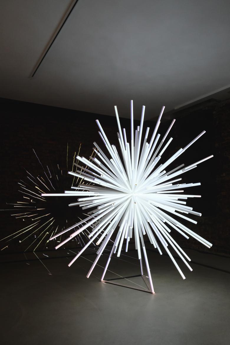 186 Keramikrohre werden sphärisch um einen statischen Kugelhohlkörper gruppiert. Ein kristallin wirkendes weißes Objekt mit einem Gesamtdurchmesser von 2.700 Millimeter entsteht. Überlagert von mehrdimensionalen Projektionen taucht das imposante Raumobjekt in immer neue atmosphärische Bedeutungsebenen ein. Es scheint von ungreifbarem Volumen, wirkt fragil, stabil, zentral, spektral und explosiv zugleich. N186 vereint verschiedenste Aspekte des architektonischen Schaffens: Konzept, Material, Design, Technik und deren präzise Realisierung.