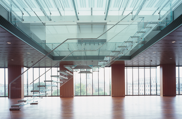 The glass staircase highlights this design strategy. The stair, which functions as a floating transitional element between new and old, was developed in close collaboration
