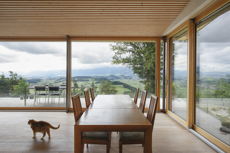 Die benötigte Wärmeenergie gelangt durch die Verglasungen direkt ins Gebäude. Die Sonne liefert den grössten Teil. Eine Wärmepumpe für Warmwasser und warme Luft deckt die Restenergie.
