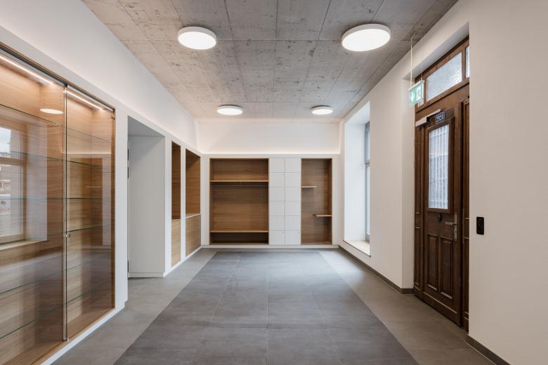 Die hohen funktionalen Anforderungen der Nutzerin und die in die Jahre gekommene Bausubstanz haben einen massiven baulichen Eingriff erfordert. Sämtliche haustechnischen Installationen sowie der Einbau eines behindertengerechten Liftes und die funktionalen Grundrissanpassungen haben zur Folge gehabt, dass sämtliche Holzbalkendecken statisch ertüchtig und teilweise durch Betondecken ersetzt werden mussten. Der Verbleib einer Schreinerei mit ihrer Werkstatt im Erdgeschoss hat den Umbau zusätzlich erschwert.