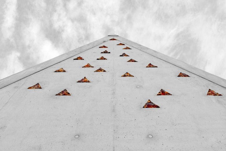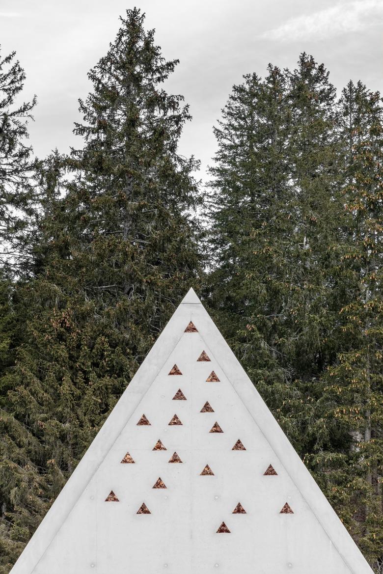 Das Gebäude in Form einer Bergspitze oder Zinne nimmt unmittelbaren Bezug auf die umliegenden Landschaftsformationen. Durch das steile und hohe Satteldach, welches quer zur Straße steht, wird die Sichtbarkeit von weitem gestärkt, wodurch der Neubau zu einem wichtigen Orientierungspunkt und einer Landmark wird. Das niedrig gehaltene Vordach reduziert das äußere Erscheinungsbild beim Nähertreten und unterstreicht die Funktion als Servicegebäude. Es wirkt einladend und ist angenehm beschützend.