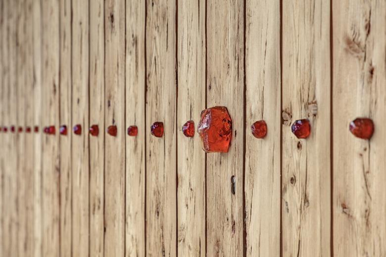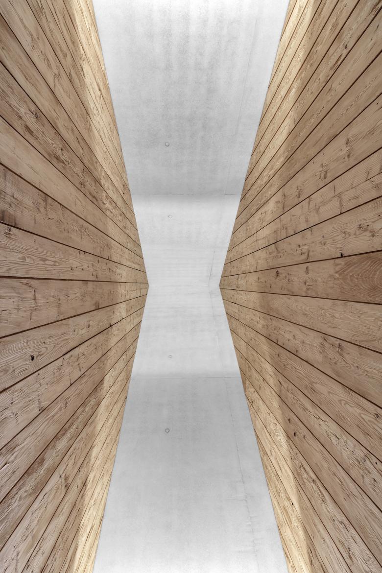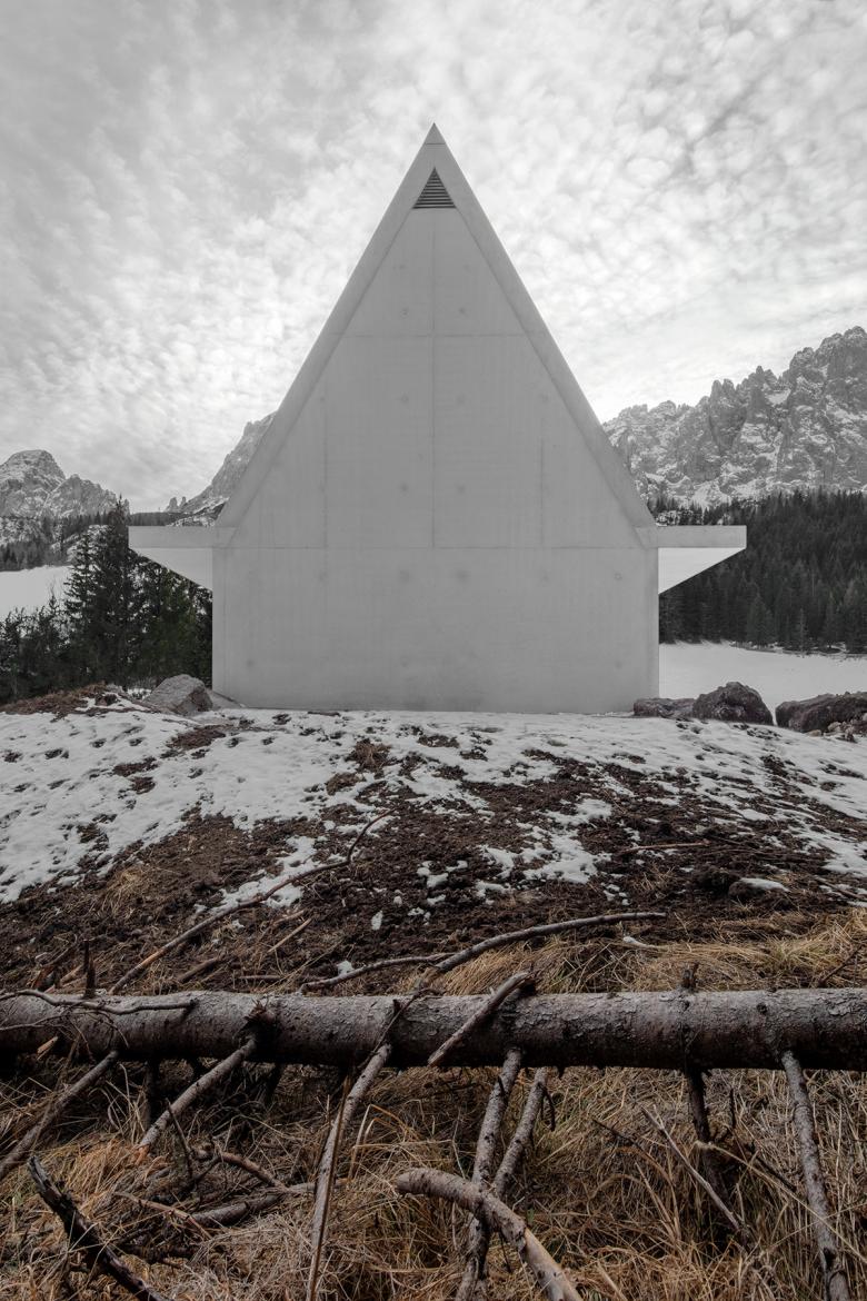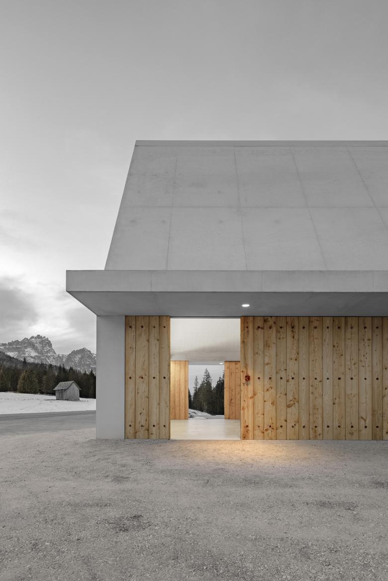 Die äußere Hülle ist in weißem Sichtbeton aus lokalem Dolomitgestein gefertigt. Der innere Kern wurde als Holzbau in handgehacktem Lärchenholz ausgeführt. Elemente aus bernsteinfarbenem, massivem Glas verbinden die beiden Materialien Beton und Holz. Sie erinnern in ihrer Erscheinung an das Baumharz der Lärchen. Die Kombination der Materialien und die handwerkliche Verarbeitung vermitteln auch an diesem rauen Ort das Gefühl von Geborgenheit und Wertigkeit.