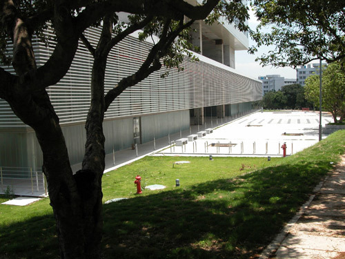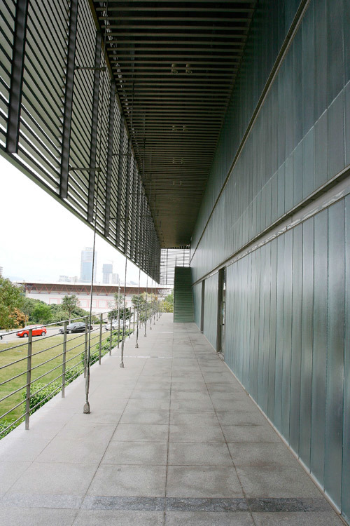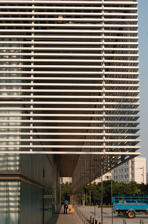 The Shenzhen University Science and Technology Building is located at the border that divides the new area and the old central area in the campus. It is separated from other buildings by lush woods. Its unique location and dominant volume make it a landmark for the entire campus. The isotropic form is dictated by this centrality and relative isolation. The building is basically a 53-meter cubic, punctuated at four sides with an a large opening, and encompassing a soaring glass tower. The central glass tube is the transportation and public activity space surrounded by research and teaching spaces. The four 30-meter-long openings provide four sky-gardens and rich plane changes in the building, as well as corridors of natural breeze. The podium houses three auditoria and a exhibition hall. It is surrounded by open colonnade °∞wrapped°± by aluminum grill. This semi transparent fa_ade redefines the architectural space and its outward views. This concrete and glass structure makes an unmistakable subtropical architectural statement.