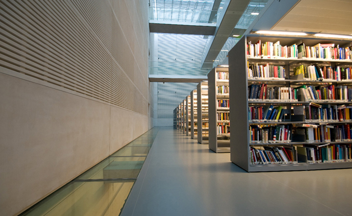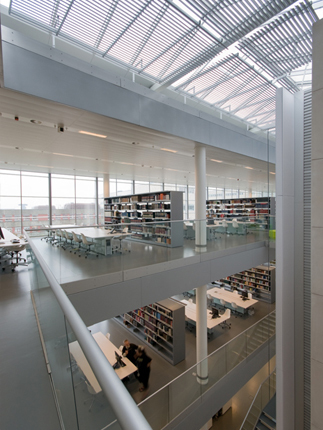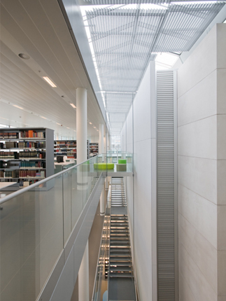 The result of this intensive planning and design process is a building characterised by fl exibility, airy openness and simple, clear defi nition. The three open fl oors have been laid out with incremental noise levels in mind – from easy socialising in the lounge and café areas to group study areas and fi nally to the library reading rooms designated for “quiet” use where students can concentrate completely on individual study. In addition to its study and reading facilities the new faculty library building houses three large archive rooms for Royal Library books and records. Award winning architecture