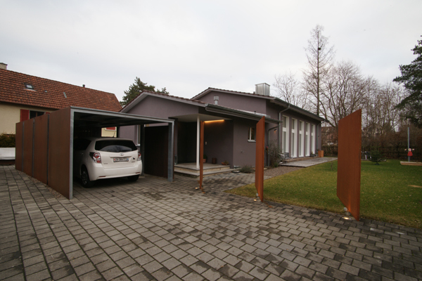 Das äussere Erscheinungsbild des Gebäudes wurde mit Ausnahme der neuen Fenstertüren zum südlichen Garten praktisch beibehalten. Lediglich ein Carport und bewegliche Sichtschutzelemente aus rostendem Stahl wurden dazugebaut.