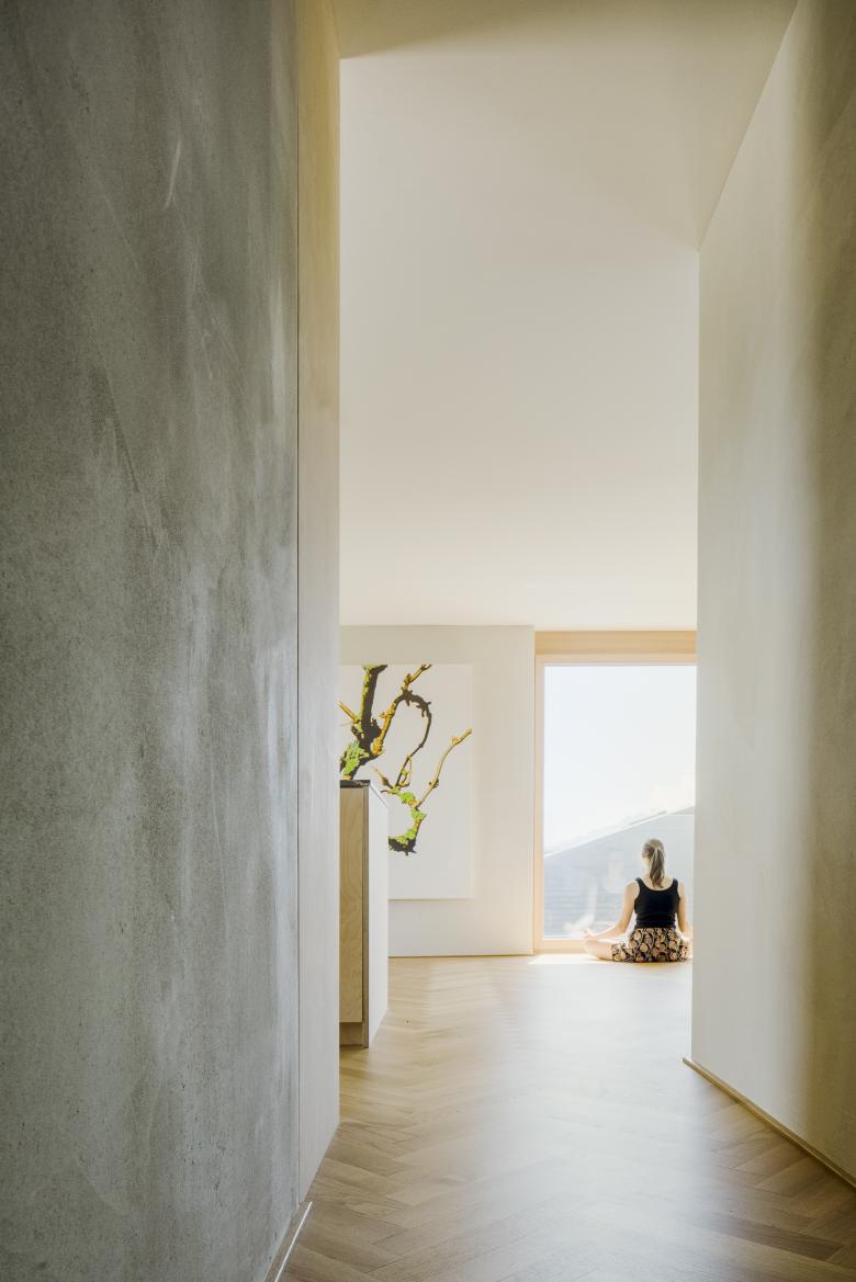 Kompakt strukturiert fächern sich die 8 Wohnungen windmühlenartig um den Erschließungskern auf. Alle Wohnungen sind dreiseitig belichtet und flexibel möblierbar. Der differenziert gegliederte Baukörper schafft platzartige Außenräume im Bereich der Terrassen und fügt sich maßstäblich in die umgebende Siedlungsstruktur ein.