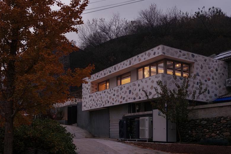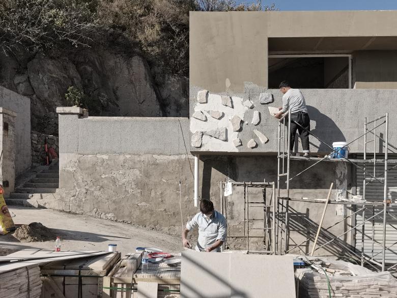 To enhance the relationship between the structure and the mountain, we chose to clad the building volume with stone. From a distance, the white box appears to float against the mountain backdrop; up close, one can see the carefully arranged stones, each piece meticulously positioned. Their color, proportion, and angles were all thoughtfully deliberated by the designers on-site alongside the craftsmen. Instead of using traditional masonry techniques with filled joints, the stones were dry-hung individually onto the wall. Due to the varying thickness of the stones, the grout naturally formed subtle curved transitions on the surface, blending wild charm with a touch of liveliness. The final texture evokes the feel of nougat—a delightful surprise that emerged unexpectedly during the design process.