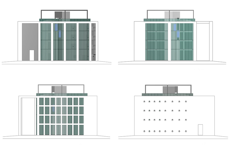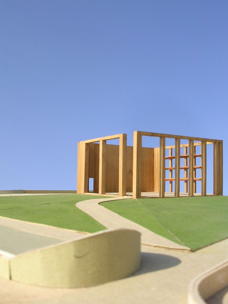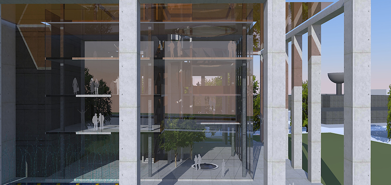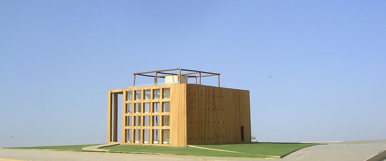 The desire of the client for a Glass box as an image of a corporate office in the middle of parched land and arid climate demanded a significant gesture of an envelope. The whole assembly of box and envelope is placed on a raised sloped landscape for ceremonial entry and views. The building is rotated to align with the cardinal directions and each of the fascias of this envelope was placed and detailed in relation to the sun path. A tensile structure becomes the horizontal envelope on all sides of the building and spaces of varying depths under it serves as driveway, arrival porch, service bay and storages insulating the glass box.