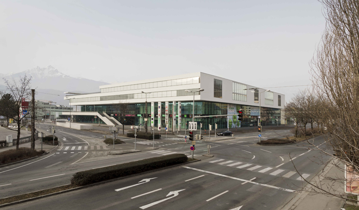 Entlang der durchgehenden Mittelzone sind zwei weitere, Ruhe stiftende Atrien (mit schönem Nordkettenblick) angeordnet. Keine der Stammklassen ist zu den lauten Straßen orientiert, Blickbeziehungen vom Schulinneren nach außen und umgekehrt dennoch möglich. Die 4 Klassencluster pro Geschoss sowie die Sonderräume sind zusätzlich durch offene Brücken quer verbunden.