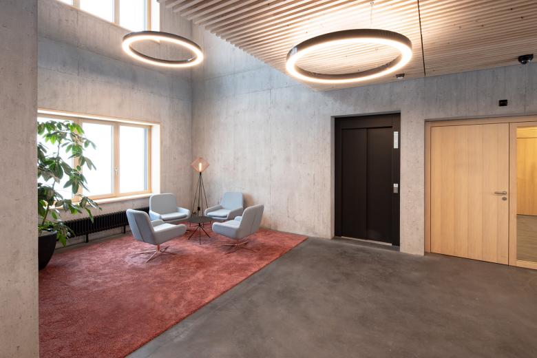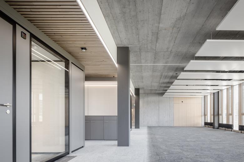 Innen ermöglicht die rasterartige Strukturierung langfristig eine hohe Flexibilität bei der Gestaltung von Arbeitsplätzen. Die Geschosse sind als offene Bürolandschaften geplant. Die klare innere Organisation widerspiegelt sich Aussen in der Fassade. Im Gegensatz zur warmen Farbgebung und Holzelementen im Innern steht die robuste und beständige Aussenhülle mit Betonelementen und einem grob verputzten Sockel. In der Tiefgarage befinden sich auf zwei Ebenen rund 50 Parkplätze.