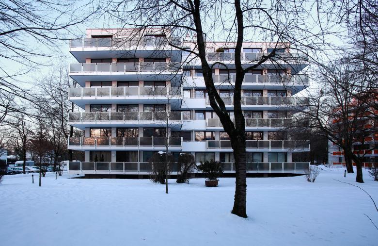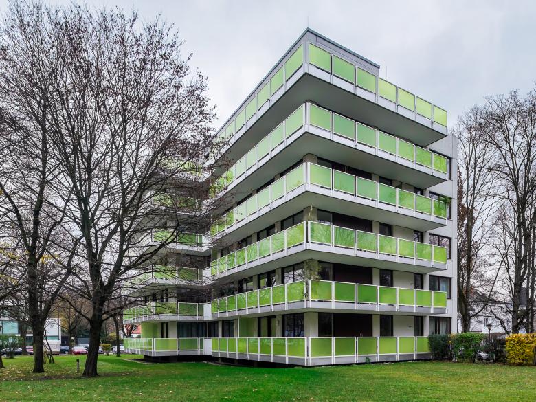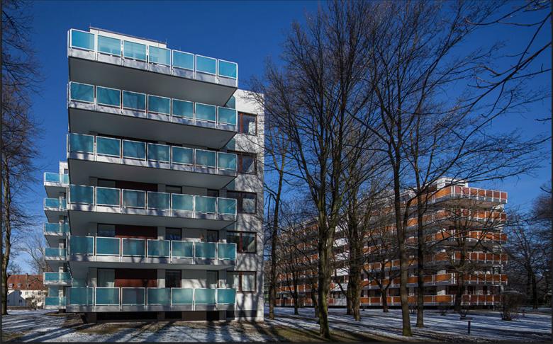 Beim gezeigten Projekt handelt es sich um die Sanierung von vier baugleichen Häusern am Englischen Garten in München. Die von Professor Josef Wiedemann 1970 am Rande des Englischen Gartens gebauten Häuser zeichnen sich durch ihre hohe architektonische Qualität aus und beinhalten insgesamt 48 Wohnungen. Nach Jahren ohne bauliche Anpassung an moderne Standards war es notwendig geworden, verschiedene Instandsetzungs- und Modernisierungsmaßnahmen durchzuführen. Unter anderem mussten dringend die Fassaden ausgetauscht und die Balkone saniert werden. Da die Fassaden der Häuser sich genau gleichen, wurde bereits im Erbauungsjahr 1970 jedem einzelnen Gebäude durch textile Sonnenschutzeinrichtungen in den Farben Blau, Rot, Gelb oder Grün seine eigenständige Identität zuteil, so dass die Häuser sich farblich voneinander unterschieden. Diese Sonnenschutzvorhänge waren bei Beginn der Baumaßnahmen nur noch rudimentär vorhanden. Da uns die Idee der Adressbildung durch Farben für die grundsätzlich baugleichen Gebäude gut gefiel, wurde sie von uns aufgegriffen und weitergeführt: Die gläsernen Brüstungen wurden für jedes Haus individuell mit einer Farbe besetzt. Insgesamt 1.500 m beträgt die Gesamtlänge der umlaufenden Balkone. Der für uns interessante Aspekt der Arbeit in der Osterwaldstraße war der Umgang mit bestehender Bausubstanz der Siebziger Jahre und der Arbeit des renommierten Professors Josef Wiedemann. Ein in den Fünfziger Jahren in München stark am Wiederaufbau der Stadt beteiligter Architekt, der für viele Kirchenbauten der Sechziger und Siebziger Jahre verantwortlich zeichnet. Der behutsame Umgang mit dem Vorhandenen war uns ein wichtiges Anliegen bei den baulichen Veränderungen. Mit wenigen gezielten Maßnahmen erhalten die Häuser nun ein wertiges und modernes Erscheinungsbild.