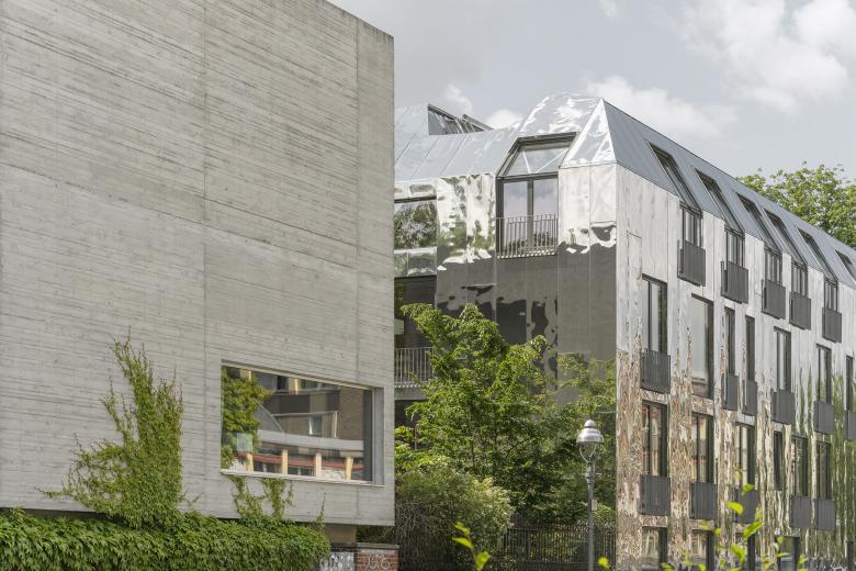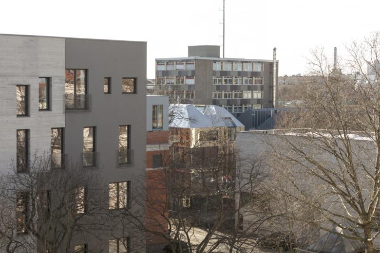Am Eingang zum Areal entstand 2015 mit Haus 9 ein Neubau für eine Baugruppe. Sein Außenvolumen ist ein Resultat der Ausnutzung baurechtlicher Möglichkeiten auf dem Grundstück. Von den historischen Nachbarn hat das Haus die hohen Decken, die großzügigen Fenster und die einfache Grundstruktur geerbt. Die von Etage zu Etage wechselnden inneren Räumlichkeiten zeugen von den individuellen Vorstellungen, die die verschiedenen Mitglieder der Baugruppe vom Wohnen und Arbeiten haben.
