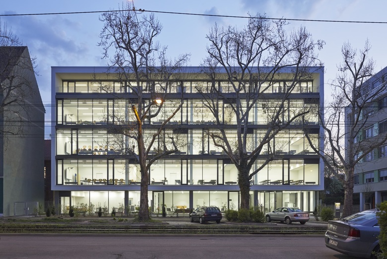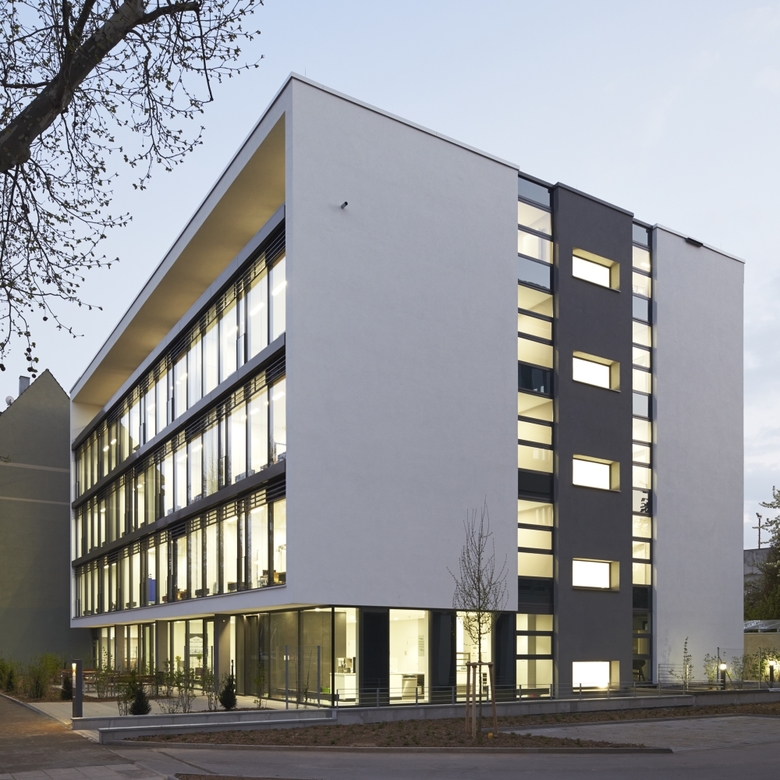 Zum öffentlichen Straßenraum öffnet sich die Fassade "schaufensterartig" und zeigt die Nutzung mit Lehrsälen gut ablesbar nach außen. Das zurückspringende Dachgeschoss wird durch eine Dachterrasse rahmenartig gefasst und trägt zur Dreigliedrigkeit der Fassade bei - Sockelgeschoss, Hauptgeschosse, Dachgeschoss. Rückseitig bringt eine Bänderfassade ausreichend Belichtung in Verwaltungs- und Seminarräume. Das Gebäude vermittelt unprätentiös zwischen der Satteldachbebauung und dem hohen Flachdachgebäude des Landesgesundheitsamtes.