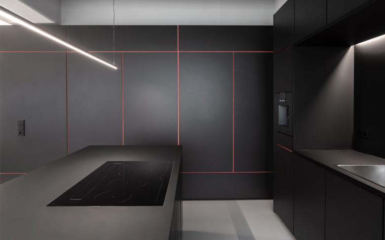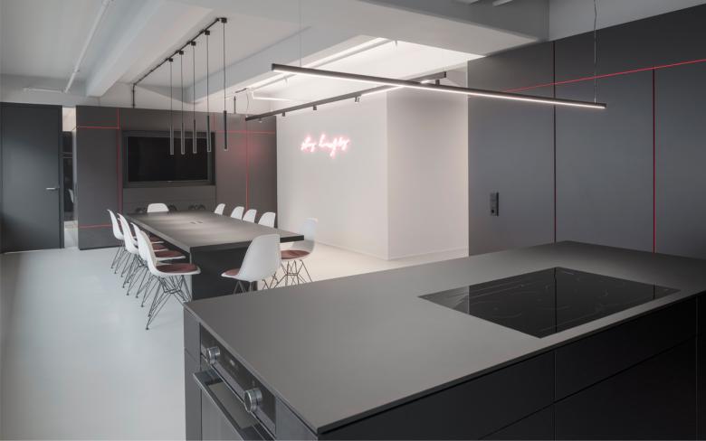 Der Hell-Dunkel-Kontrast setzt sich als gestaltungsgebendes Element auch am Boden fort. Alle raumbildenden Ausbauten und Einrichtungsgegenstände, die auf der hellen, fugenlos verarbeiteten Industriebeschichtung stehen, sind schwarz. Vereinzelt blitzen Farbklekse aus dem strengen Farbkanon hervor. Allen voran verleihen die strahlend neonorangen Möbelfugen der gesamten Szenerie eine spielerische Frische.