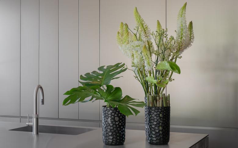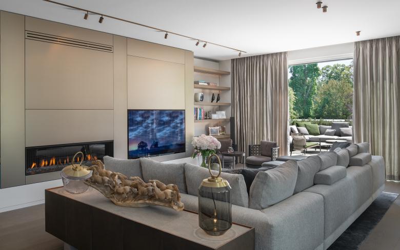Türen spielen auch im offenen Wohnbereich eine wichtige Rolle. Ihre eloxierte Aluminium-Oberfläche schimmert geheimnisvoll im Tageslicht. Hinter den Türen verbergen sich in der Küche beispielsweise zwei Backöfen und eine Nische zur Kaffee- und Teezubereitung. Im Wohnzimmer tritt per Knopfdruck ein verdeckter Fernseher in Erscheinung.