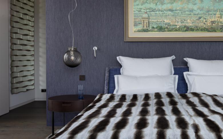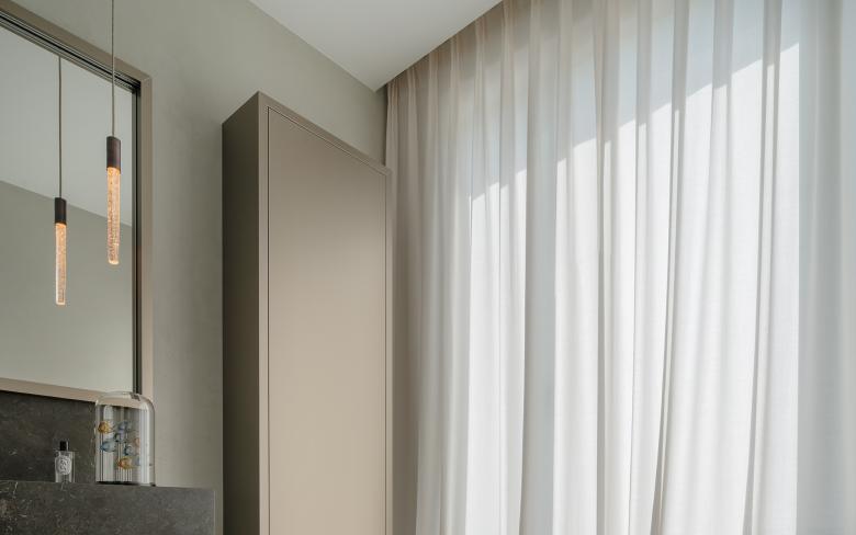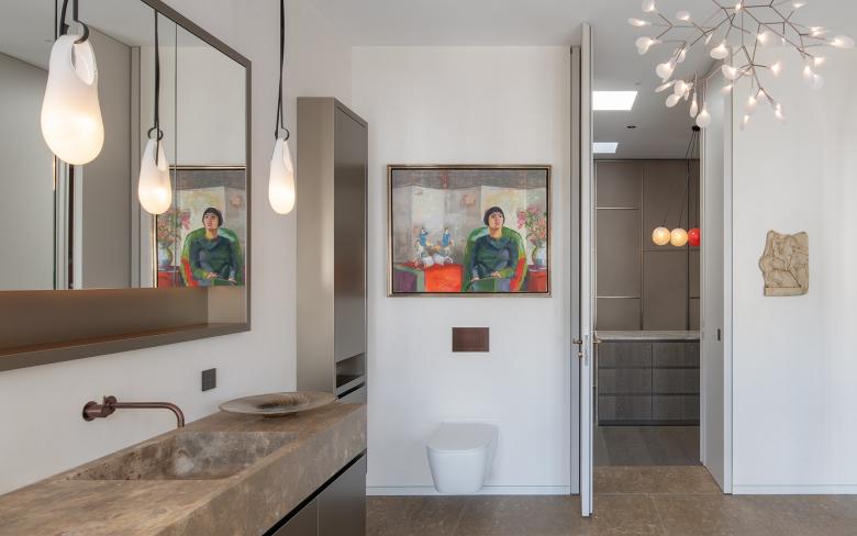 Das Farb- und Materialkonzept basiert auf Bronzefarbtönen in verschiedenen Schattierungen, die mit edlen Naturmaterialien kombiniert werden, wie Anilinleder in den Füllungen der Rahmentüren der Ankleide, gebürstetes Messing und venezianisches Glas bei den dekorativen Leuchten. Ein besonderes Augenmerk gilt der Kochinsel, deren Fronten aus fein geädertem Marmor gefertigt sind. Mit Ausnahme der Bäder sind auf allen Böden großformatige, dunkle Holzdielen verlegt.