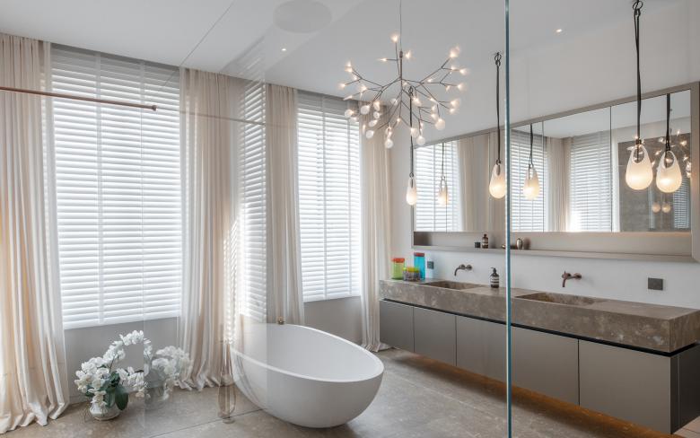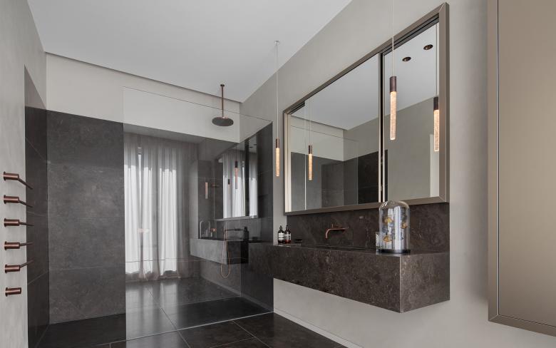 In den Bädern treffen Bronzearmaturen auf Naturstein, dessen Farbton sich von Bad zu Bad unterscheidet. Im Masterbad ist es ein milchkaffeefarbener Dolomit aus dem Altmühltal, im Duschbad der schwarz-braune „Pietra d´Avola“ von den toskanischen Natursteinspezialisten Salvatori und im Gästebad im 1. Obergeschoss ist es der helle Sandstein „Crema D´Orcia“, ebenfalls von Salvatori.