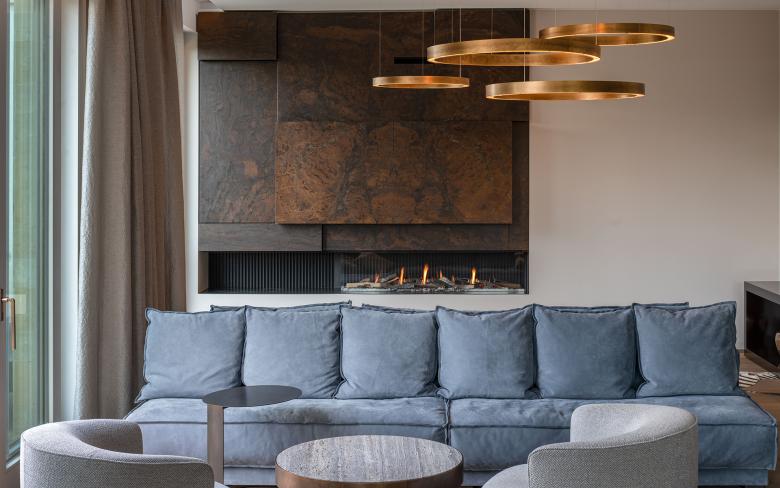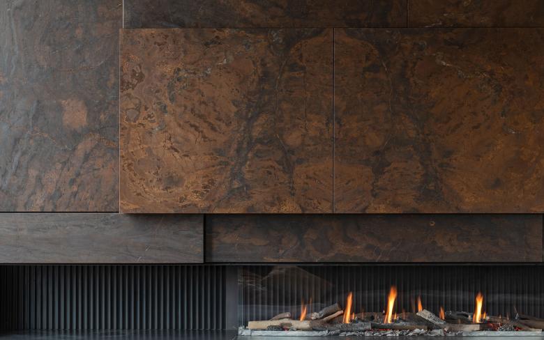Zentral und frei im Raum steht ein glänzender Möbelkubus. Auf seiner Oberfläche spiegelt sich der umgebende Raum. Die Kochinsel ist aus Naturstein gefertigt, auf dessen gebürsteter Oberfläche sich ein Geflecht aus Gesteinsadern in unterschiedlichsten Braunschattierungen abzeichnet. Die Platte des Esstischs besteht aus vier Meter langen, geköhlten Eichenbohlen, deren unbesäumte Tischkanten den natürlichen Wuchs des Baums beschreiben. Im angrenzenden Wohnzimmer ist die Wandbekleidung über dem Kamin aus vor- und zurückspringenden rostbraunen Steintafeln gefertigt. Auf Knopfdruck fahren die beiden zentralen Steintafeln zur Seite und geben den Blick auf einen Fernseher frei.