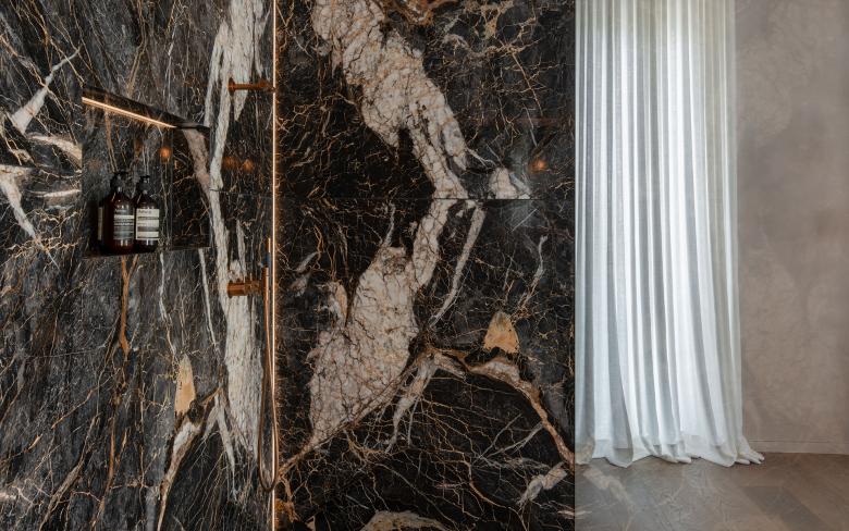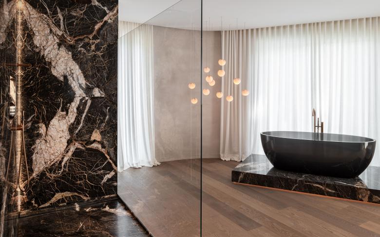 Im Gegensatz zu den warmen Naturstein- und Holzfarbtönen der Einbauten sind die Polstermöbel in kühlen Blautönen bezogen. Die Treppenläufe und die Fußböden in Staffel- und Obergeschoss sind einschließlich der Bäder mit bernsteinfarbenen Eichendielen belegt. Waschtisch, Dusche und Wannenpodest sind aus Nero Portoro gefertigt, einem exklusiven dunklen Marmor mit cremeweißer und bernsteinfarbener Maserung. Schmale Lichtfugen setzen stimmungsvolle Akzente. In den beiden Ankleiden sorgen sie dafür, dass die Decke über den Schränken zu schweben scheint. Die Abdeckungen der Wäscheblöcke sind aus massiver Bronze gefertigt.