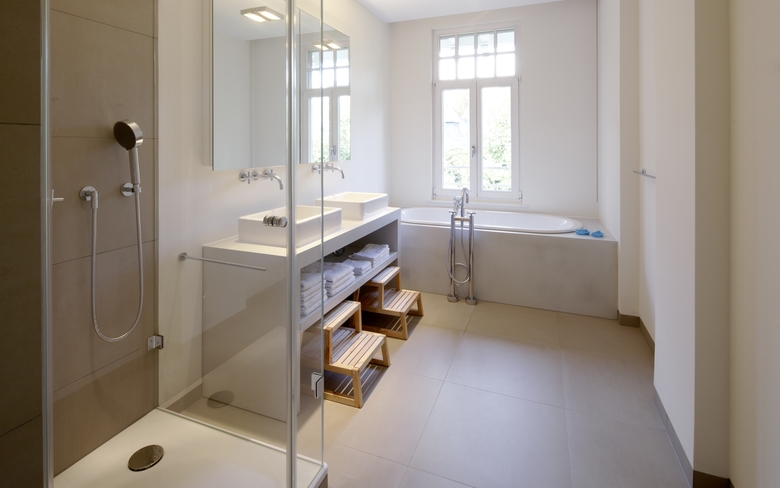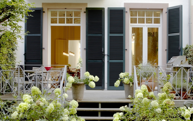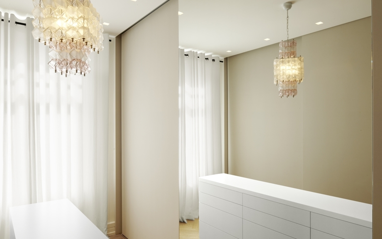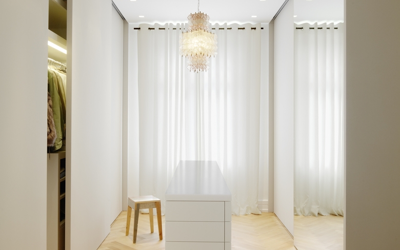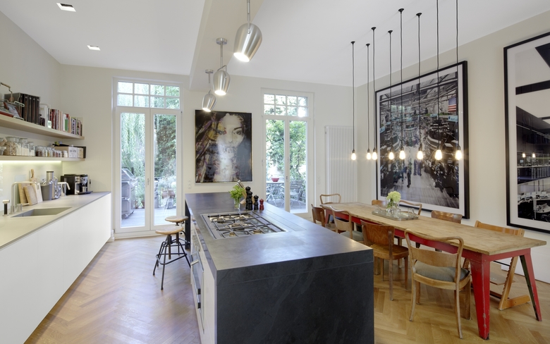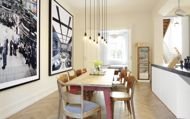 130 Jahre lang hat dieses Wohnhaus im Frankfurter Westend seinen Altbaucharme bewahrt, obwohl mit den Jahren so manches Stilmerkmal aus der Gründerzeit verloren gegangen ist. Angelehnt an das Erdgeschoss ist im 1. Obergeschoss neues Eiche-Fischgrät-Parkett verlegt worden. Die Holztreppe hat ein neues, für die Gründerzeit typisches Geländer erhalten und passend zu den Zimmertüren steht auf dem Treppenpodest heute ein Garderobenschrank mit profilierten Fronten. In den Wohnräumen entfaltet sich der persönliche Stil der Bewohner: eine legere Mischung aus Purismus und Vintage-Design eingebettet in des Flair eines Stilaltbaus. In der Ankleide laufen schlichte große Schiebetüren vor den Raum hohen Kleiderschränken. In einer der Türen spiegelt sich eine Glas-Pendelleuchte aus den 60er Jahren.