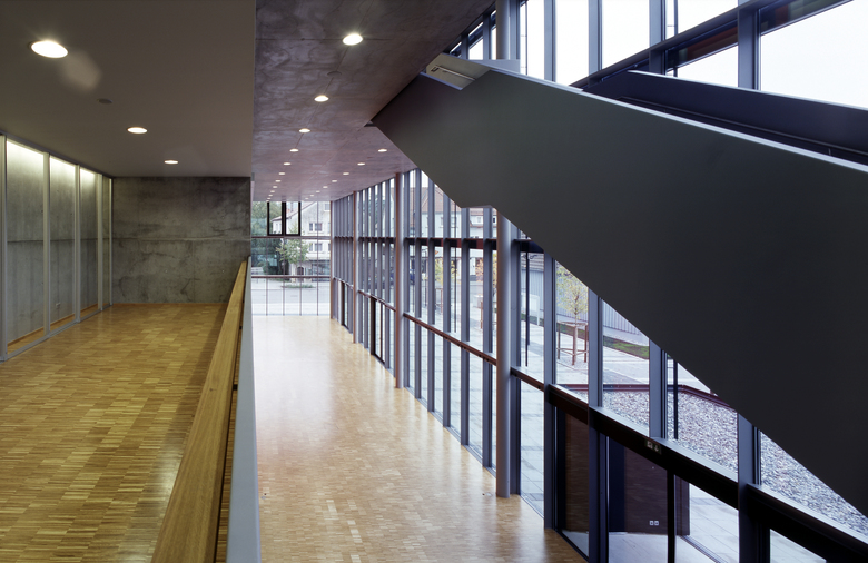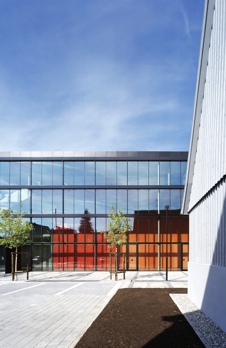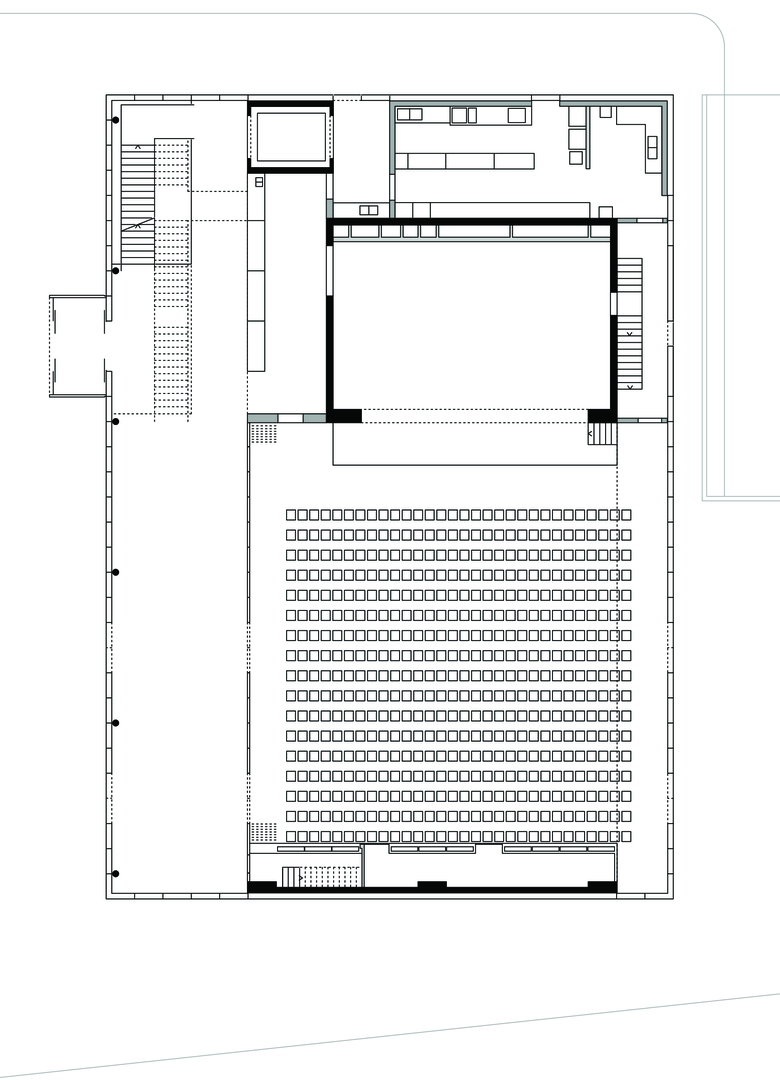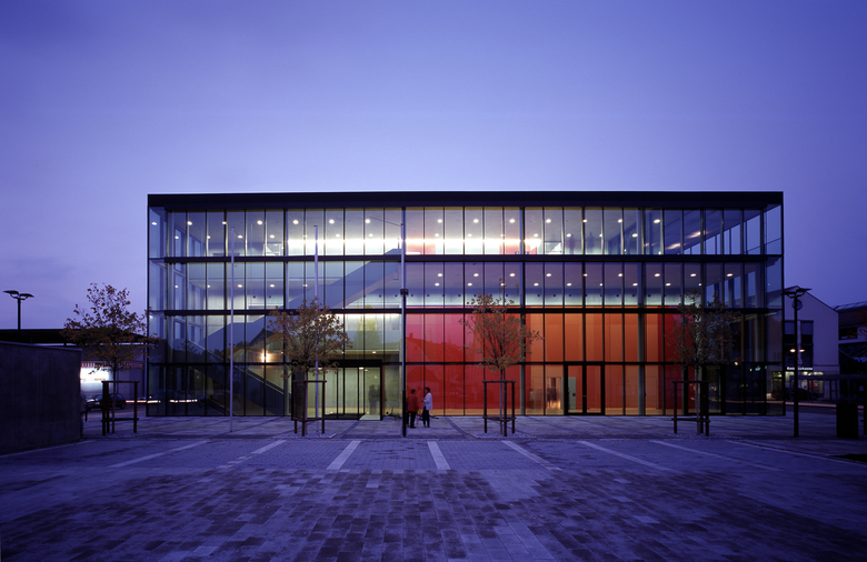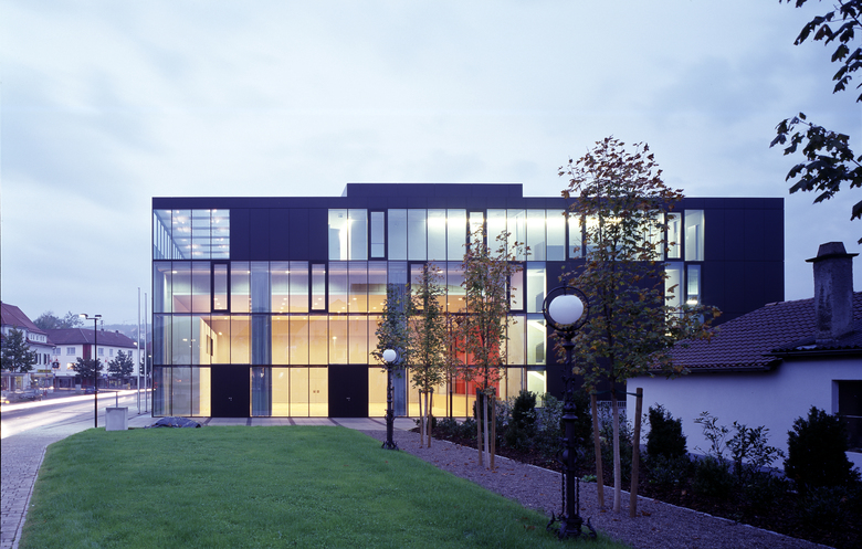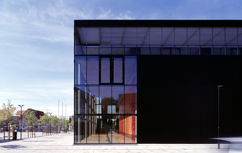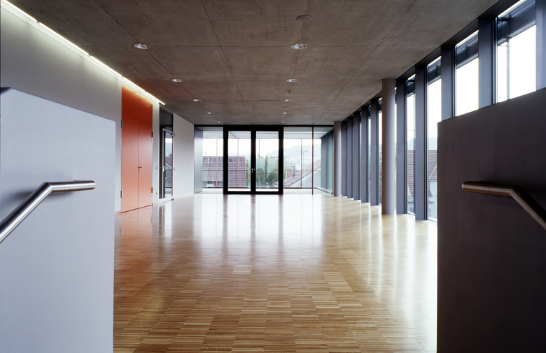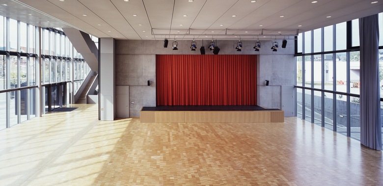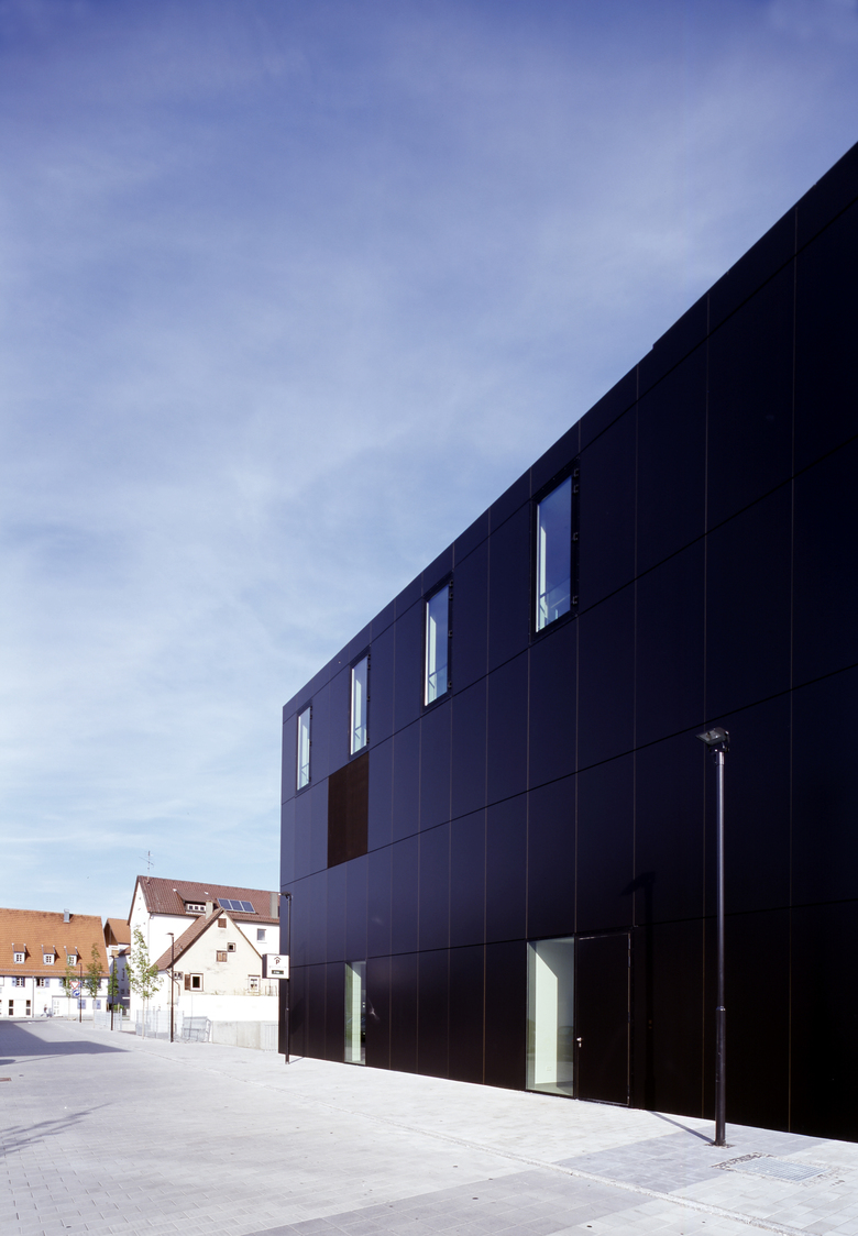 Die Planung des Gebäudes wurde maßgeblich durch die städtebauliche Idee geprägt ein Kulturzentrum - nicht wie üblich in der Fläche - sondern als Geschoßbau zu entwickeln. Dadurchverblieben im städtebaulichen Kontext der Stadtmitte von Uhingen wertvolle Flächen unbebaut die als Freibereiche genutzt, oder zu einem späteren Zeitpunkt überplant werden können. Die Umsetzung der Idee gestapelter Versammlungsräume die durch ein vertikales Foyer erschlossen werden, wirkte sich neben einer Nutzungsverteilung auf vier Ebenen zwangsläufig auch konstruktiv aus. So wurde der große Saal im Erdgeschoß durch eine weit gespannte Deckenkonstruktion mit drei Unterzügen überbrückt, auf deren Fläche weitere kleinteiligere Säle und Konferenzräume angeordnet sind. Das innenräumliche Konzept basiert auf der Interaktion zwischen eingestellten Volumen und äußerer Hüllfläche: Innerhalb eines durch die Gebäudefassade formulierten Raumes werden massive Bauteile und Kuben frei angeordnet, und teilweise vertikal gestapelt. Die verbleibenden Raumfolgen zwischen Fassade und den eingestellten Körpern dienen der Erschliessung und Kommunikation.