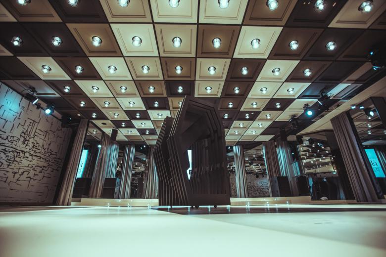 Der Boden des Konferenzsaals spiegelt die Farben der Decke wieder und formt ein geometrisches Spiel von Formen und erdtönigen Farben. Ein Raumteiler - welcher der Veranstaltungsstätte ihren Namen gibt - ähnelt einem mobilen schwarzen Berg. Er wirkt nicht nur als optisches Highlight, sondern schafft für unterschiedliche Voraussetzungen einen variablen Raum.