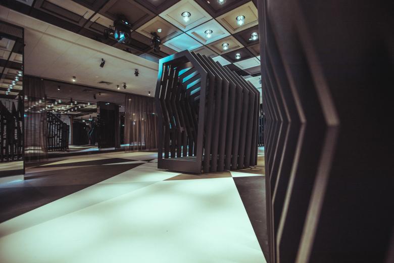 Dreidimensionale, geometrische Blöcke können auf unterschiedlicher Weise kombiniert werden. Sie lassen gebrochenes Licht in den Raum. Es entstehen überraschende, aber auch irritierende optische Effekte, die die Vorstellungen von Bewegungen und optische Täuschungen erzeugen. Die graphischen Elemente spiegeln sich in den großformatigen Spiegeln und so wird das Raumerlebnis nahezu ins unendliche vergrößert. Das Graffiti der Decke bildet einen Bezug zu der Arecibo-Botschaft - eine binär codierte Botschaft, welche Informationen über die Biologie des Menschen enthält.