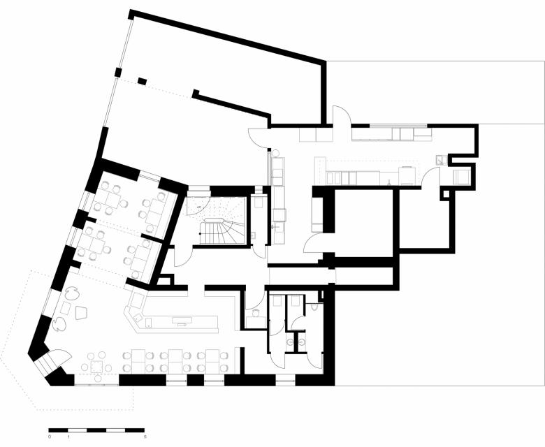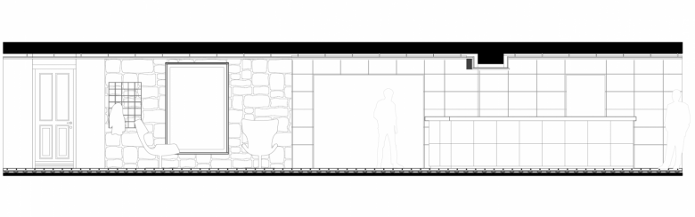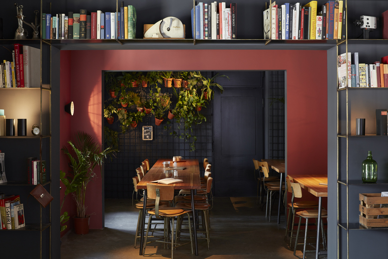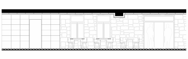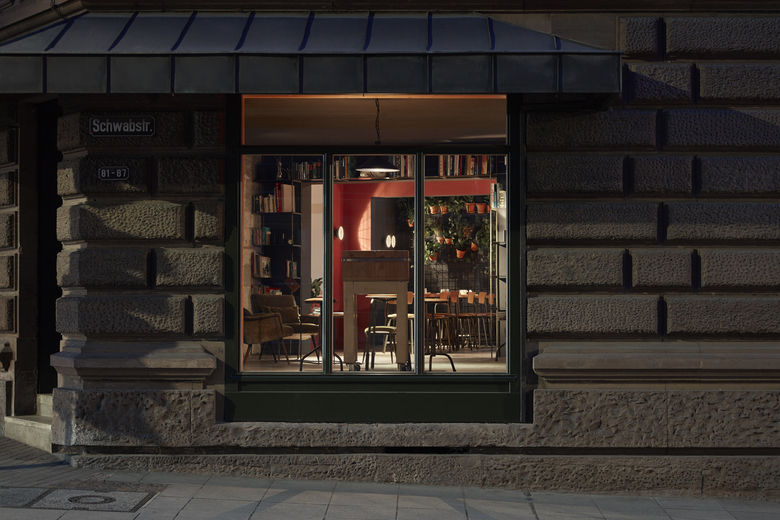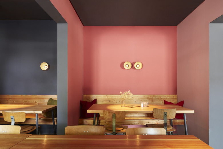 Das in drei Teilräume gegliederte Lokal – einen Hauptgastraum mit Theke sowie zwei weitere kleinere, intimere Raumbereiche – bietet den Gästen ein gut abgestimmtes Angebot an Sitzmöglichkeiten, vom informellen Zusammenkommen im Loungebereich, der sich um eine tiefe hölzerne Sitznische in der Fensterleitung zum Platz orientiert, sowie an der mit Rindslederpanels bekleideten Bar, die den Hauptraum dominiert, bis hin zu intimen Sitznischen mit einfachen Bänken aus gebürstetem Lächenholz. Im hinteren der beiden kleinen Räume bilden an einfachen Bewehrungsmatten in Tontöpfen aufgehängte Grünpflanzen ein lebendiges und natürliches Wandbild, das sich klar vor dem schwarzen Wandhintergrund abzeichnet.