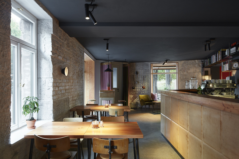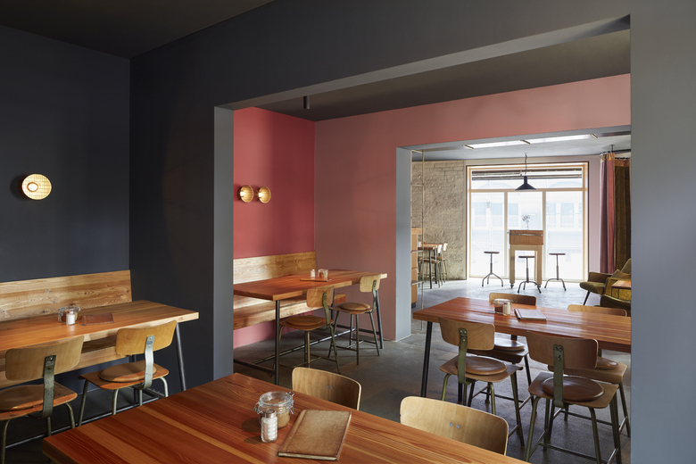 Authentische Materialien und Natürlichkeit prägen die Stimmung. Die Materialauswahl beschränkt sich hierbei im wesentlichen auf mit Öl behandelten Rohstahl, Leder und gebürstetes Lärchenholz. Begleitet werden diese Materialien von den Farbtönen der Wände zwischen Schwarz, Blutrot und zartem Rosa. Die klare Anmutung des Raums mit seinem archaischen Mobiliar kontrastiert mit den Akzentwänden aus zartem Rosa, verspieltem Tischgedeck und spannendem Flohmarktfundus. Kleine Details wie die runden Ledersitzkissen mit roter Naht, die das Sitzen auf den rustikalen Werkstattstühlen angenehm machen, offenbaren die Auseinandersetzung mit jedem Detail, was sich auch in der Küche widerspiegelt.