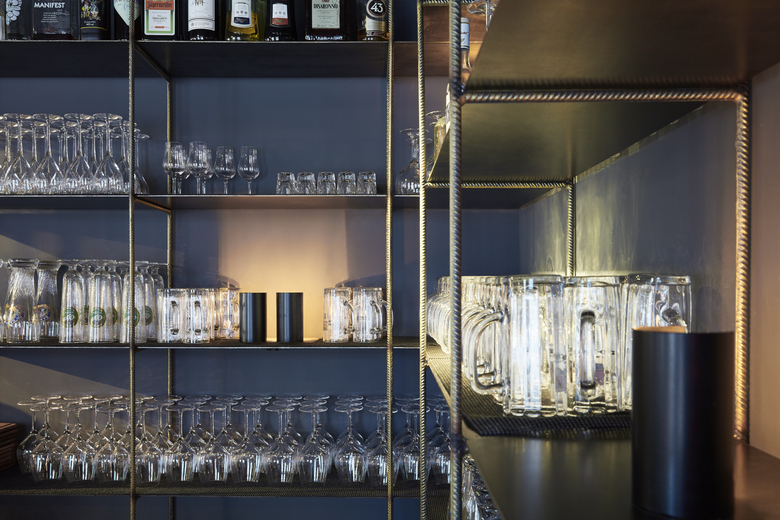 Das aus Bewehrungseisen geschweißte Regal begleitet die Wand hinter der Theke und verschwindet mit seinen schwarzen Fachböden. Lediglich die vertikalen Bewehrungsstäbe schimmern golden und sind somit strukturgebendes Raumelement. Hier geht es um den Inhalt. Das Stahlregal liest sich wie eine Mischung aus Bibliothek und Flohmarktstand, irgendetwas zwischen Nostalgie und Design. Man findet sich irgendwo zwischen Heute und Gestern wieder.