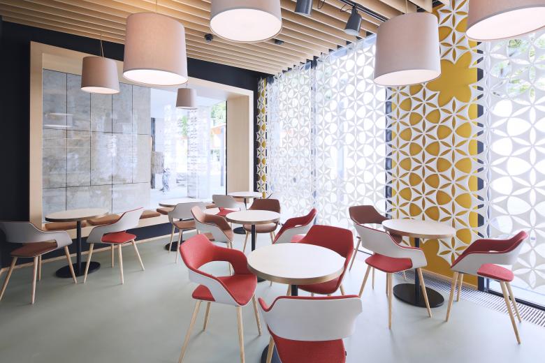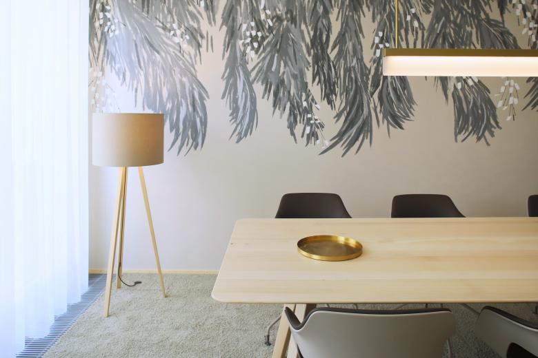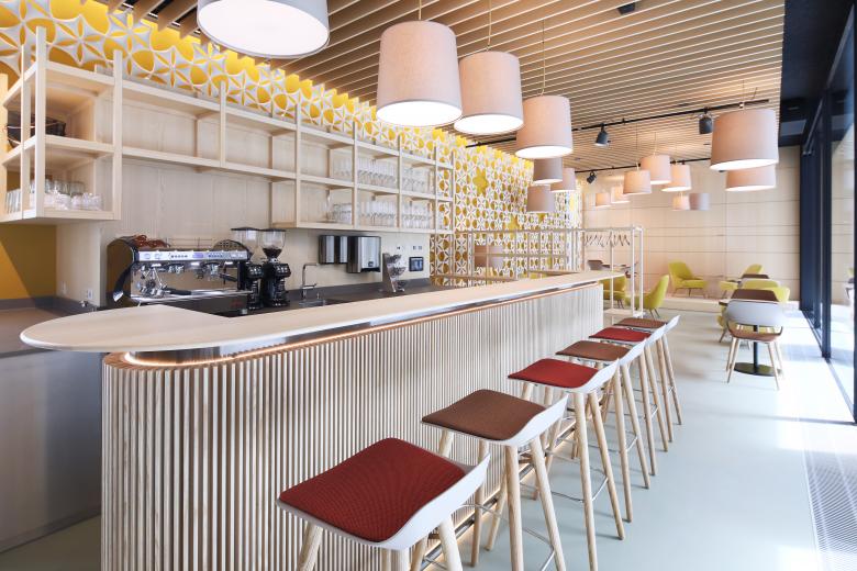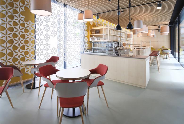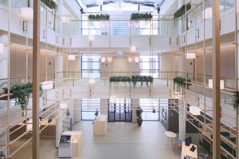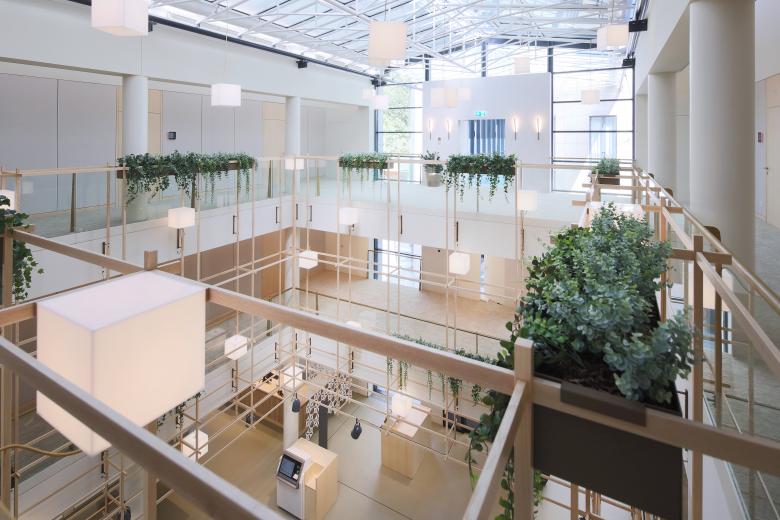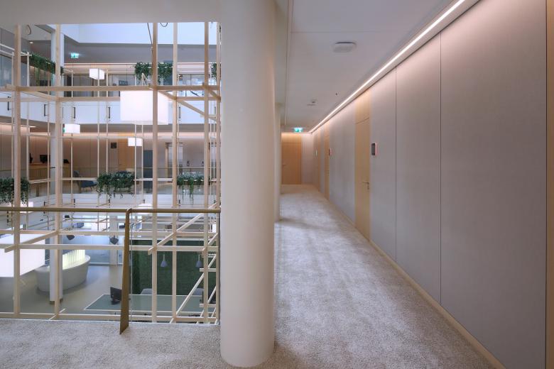 Dem grossen Lichthof verleihen Lichtwürfel in Holzstrukturen einen Lichtkunstcharakter, welcher durch Bepflanzung einen Bezug zum Aussenraum erhält. Warme Farben und Materialien tragen zur ausgewogenen Stimmung bei, welche durch dezente, aber gezielt gesetzte Beleuchtung unterstrichen wird.