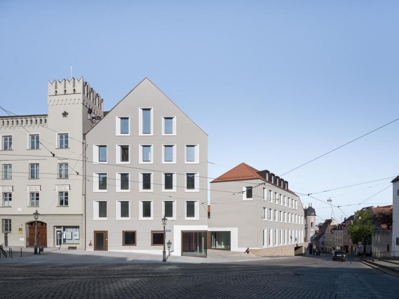 Am südlichen Ende der wichtigsten Prachtstraße in Augsburg entstand ein Neubau-Ensemble der evangelisch- lutherischen Kirche. Mit ruhigen Fassaden gestaltet das Gebäude die Ecksituation am Übergang von Urichsplatz zum Platzraum vor der evangelischen Ulrichskirche und der katholischen Basilika St. Ulrich und Afra. Um den Neubau an den Maßstab der Altstadtbebauung anzupassen, wurden der Amtssitz des Regionalbischofs, das Kirchengemeindeamt und das Pfarrhaus in einzelne Baukörper untergliedert und so zugeschnitten, dass drei Außenräume unterschiedlicher Größe und Bestimmung entstehen.