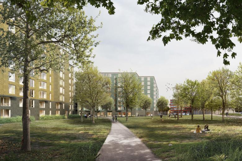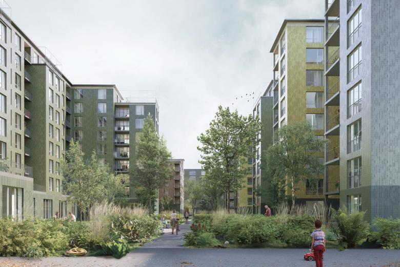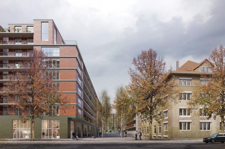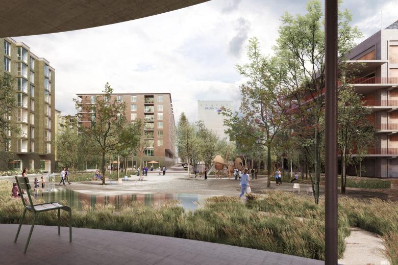 Der Quartierplatz stellt als öffentlicher Freiraum in der Arealentwicklung Volta Nord einen zentrumsbildenen Baustein dar. Er definiert sich als stadträumliches Bindeglied der Strassenräume, deren atmosphärische Qualitäten aus dem St. Johann-Quartier abgeleitet sind. Angelehnt an den Grundmustern des Quartierplatzes mit seiner klar begrenzten Aussenkante, steht er exemplarisch für einen Freiraum zukunftsweisender, nachhaltiger Entwicklungen. Den starken Rahmen des Platzes bildet ein vegetativer Saum, welcher im Biotopverbund mit der umliegenden Strassenbegrünung gedacht, ökologische und klimatologische Funktionen erfüllt. Meteorwasser wird im Sinne der Schwammstadt vor Ort gesammelt, versickert und in den Kreislauf zurückgeführt. Das Innenleben des Platzes definiert sich als Treffpunkt des Quartiers und gliedert sich in zwei typologisch unterschiedliche Bereiche. Eine multifunktional nutzbare Platzfläche mit Spielplatz im Norden sowie ein vielfältig nutzbarer Pavillon im Süden.