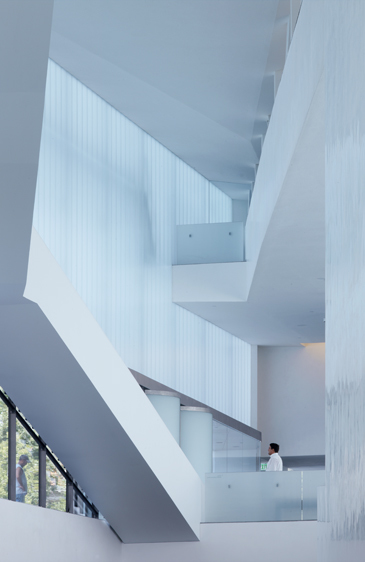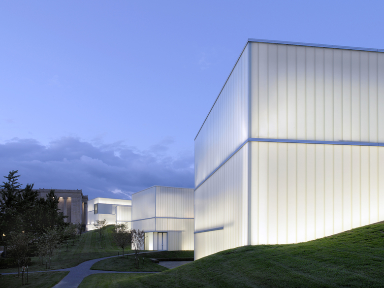 This competition winning addition is composed of five interconnected structures as opposed to a single massive expansion. Traversing from the existing building across its sculpture park, the five built "lenses" form new spaces and angles of vision. From the movement through the landscape and threaded between the light openings, exhilarating new experiences of the existing Museum will be formed. Circulation and exhibition merge as one can look from one level to another, from inside to outside. The "meandering" path in the sculpture garden above has its sinuous compliment in open flow through the continuous level of new galleries. Glass lenses bring different qualities of light to the galleries while the sculpture garden's pathways wind through them.